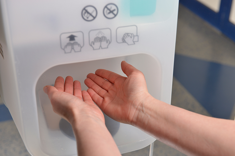 Schritt 1: Ausreichende Menge alkoholisches Händedesinfektionsmittel aus dem Spender auf die trockenen Hände geben, um diese 30 Sekunden feucht zu halten.