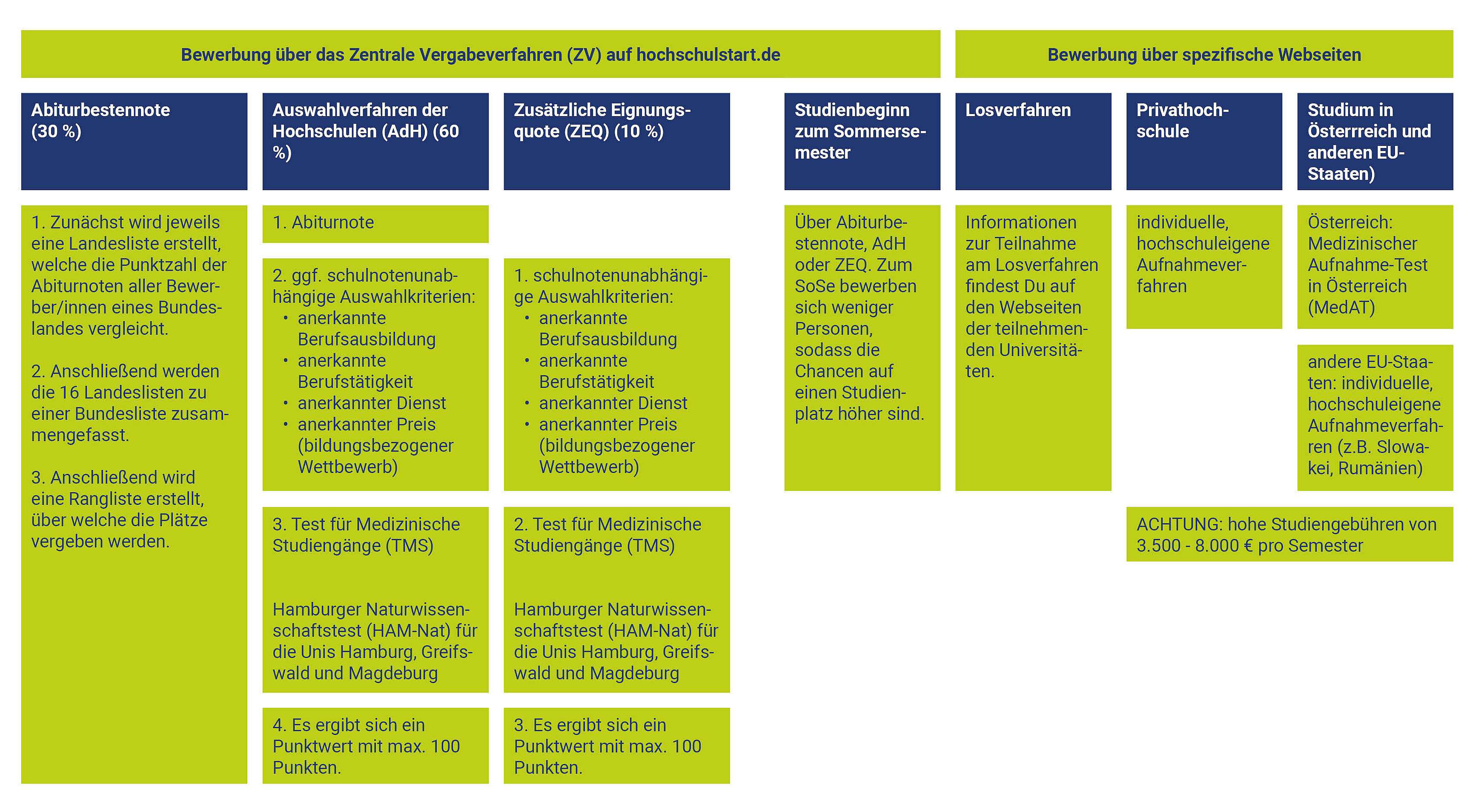 Wenn Du Dich über Hochschulstart bewerben möchtest, beachte, dass die Kriterien in AdH und ZEQ für die Zulassung regelmäßig verändert werden. Daher ist es wichtig, diese für das jeweilige Semester bei Hochschulstart zu beachten. Außerdem erhöht es Deine Chancen, wenn Du Dich für alle Hochschulen in Deutschland bewirbst (vorausgesetzt Du bist da flexibel). Ein Wechsel an die Wunsch-Universität ist manchmal im Nachhinein noch möglich.