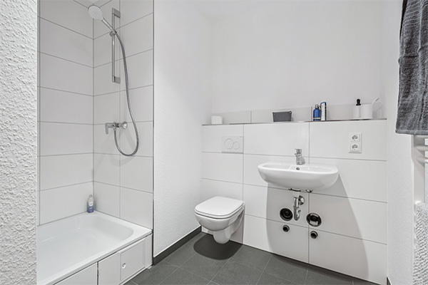Im Bad befindet sich eine Dusche mit Duschvorhang (Warmwasser über Durchlauferhitzer), ein Spiegelschrank sowie Mülleimer und Toilettenbürste. Hand- und Badetücher werden nicht gestellt.