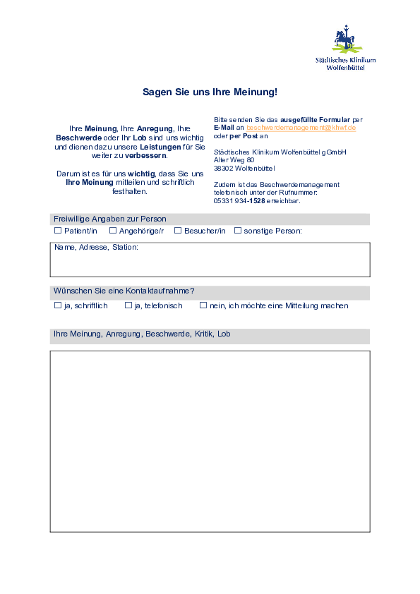 Wenn Sie mit Ihrem Klinikaufenthalt zufrieden waren, freuen wir uns natürlich sehr, aber wir bitten Sie auch ausdrücklich, auf uns zuzukommen, wenn dies einmal nicht der Fall war oder Sie einen Vorschlag haben, der uns hilft, besser zu werden.