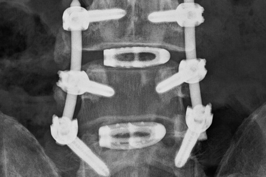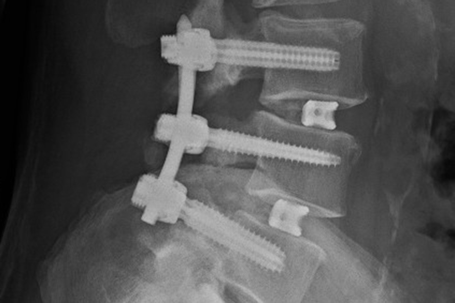 Nach Operation und Stabilisierung eines Wirbelgleitens und einer Verengung des Spinalkanals.